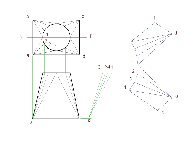 By looking at each of the triangles on the development, we can now measure and sum to find the surface area.