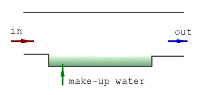 We start with the ideal arrangement known as an adiabatic saturator shown in figure 1. The walls are insulated so there is no heat flow, the outlet air is saturated and the make-up water is arranged to be equal to the leaving air wet bulb temperature.