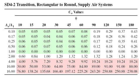 The table below has been extracted from the ASHRAE Fundamentals and shows the loss coefficient for the square to round fitting.